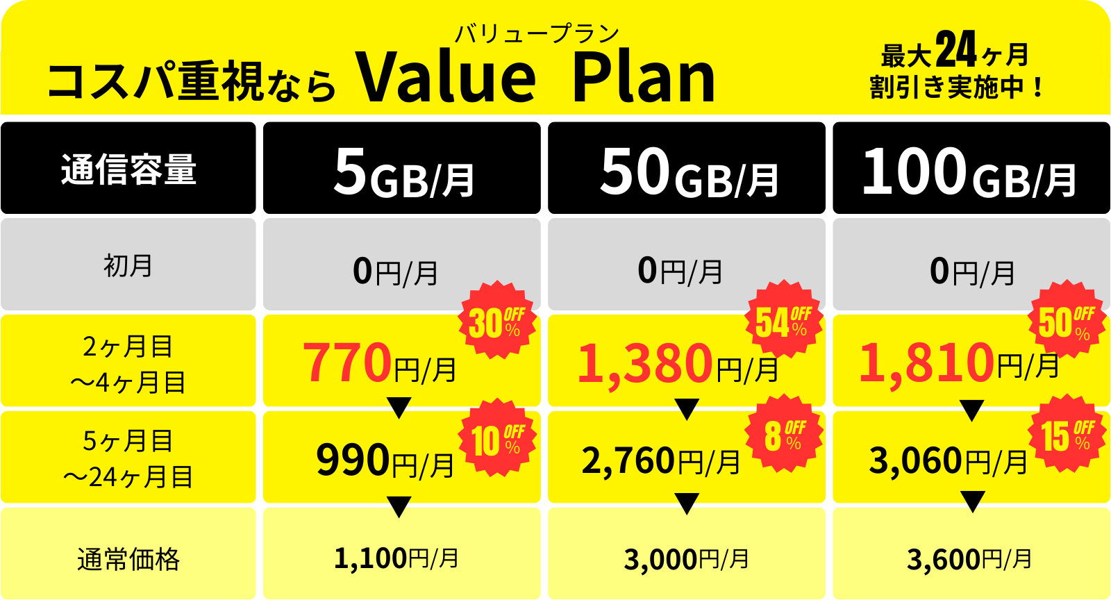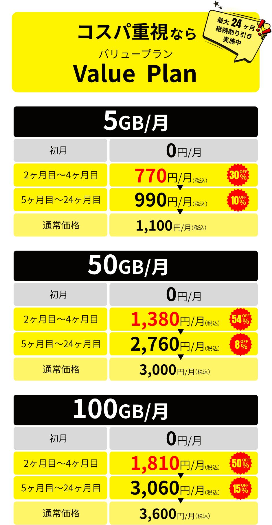 ※バリュープランは24ヶ月契約です。